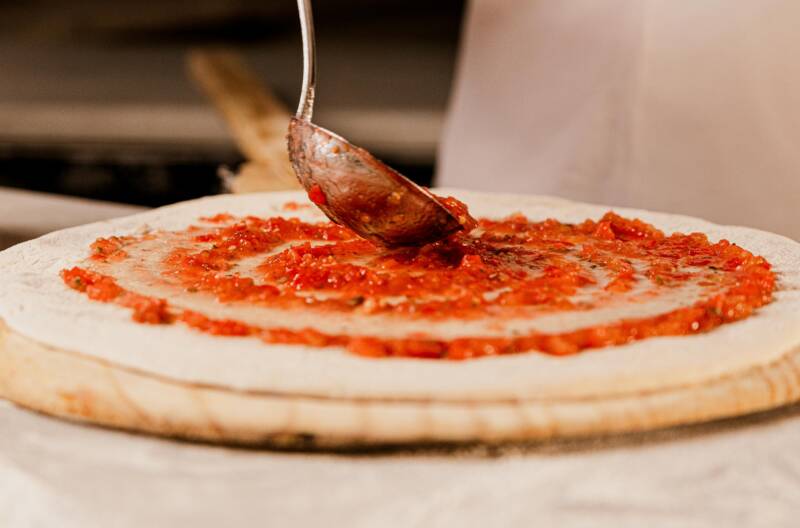- Remove the crust from the oven and spread the pizza sauce or pesto sauce over the surface.