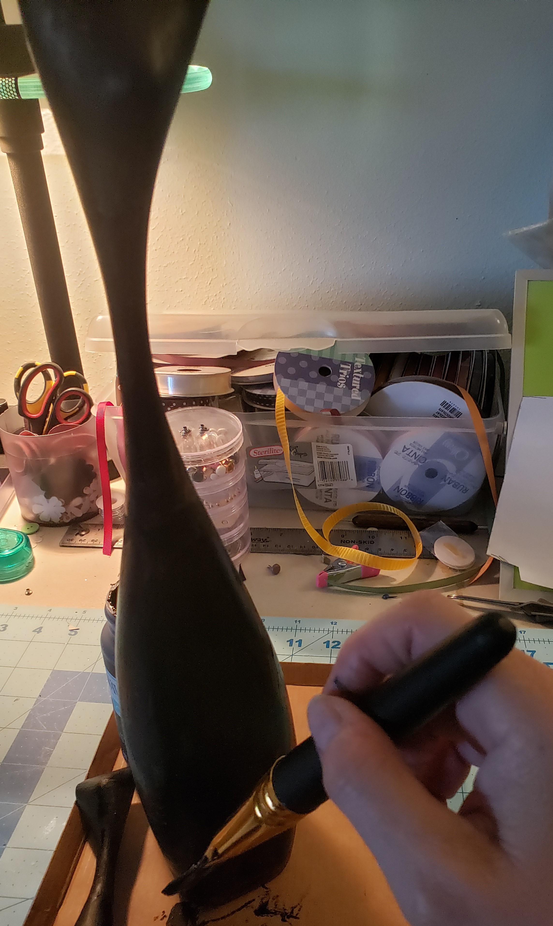 In order to form a good, circular curl on the cat tail, I used a roll of ribbon and a small can of adhesive spray as a circular line for the curling tail. You gotta use what ya’ got, right? These items on my table worked well for my needs.