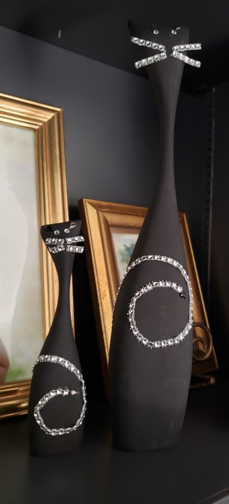 If you have items that you want to keep, but not as they are, don’t be afraid to think outside the box a little to make the item new again. I’m sure I will enjoy these glammed up black cats a lot more than if they remained brown.