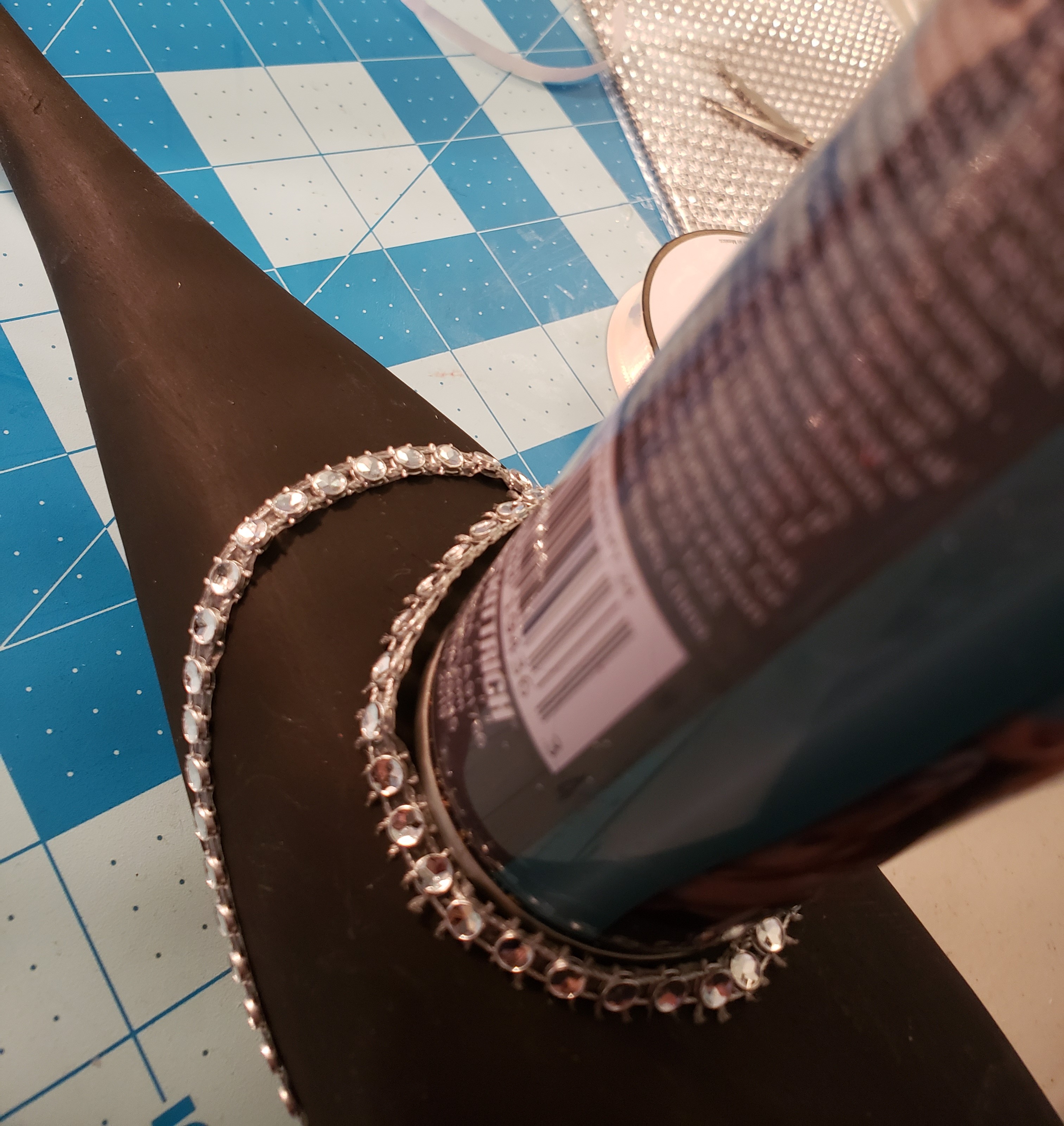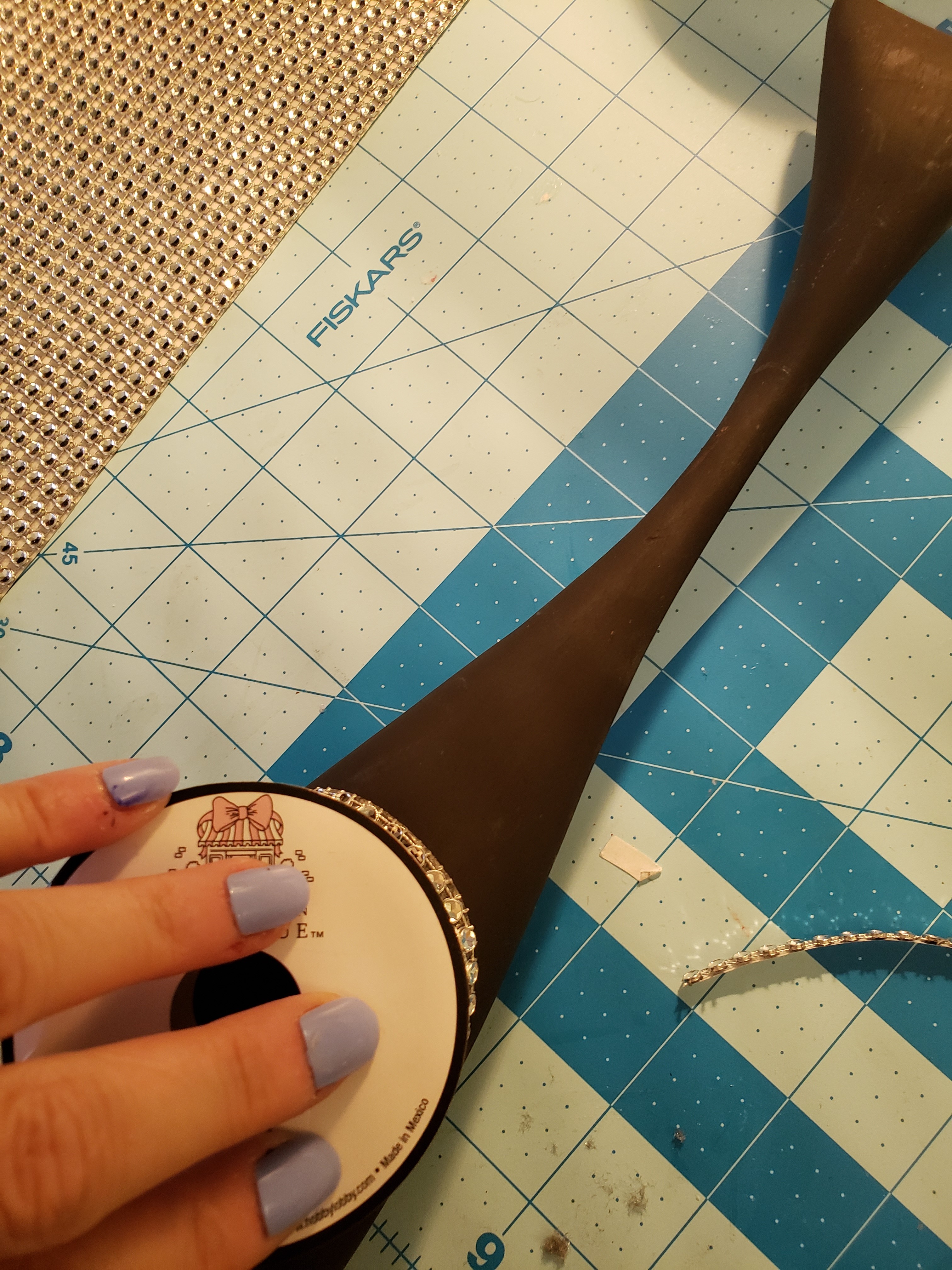 While the paint was drying, I cut two strips from a sheet of gemmies I purchased at Dollar Tree. I would use these gemmie strips for the cat tails.