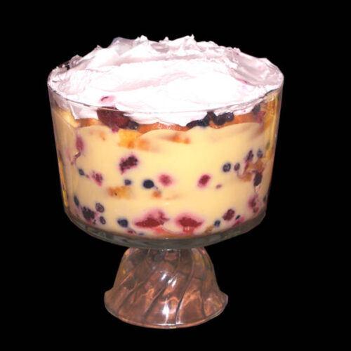 • In a trifle bowl, layer cake on the bottom, 1 cup of the berry mixture, then the cream mixture.