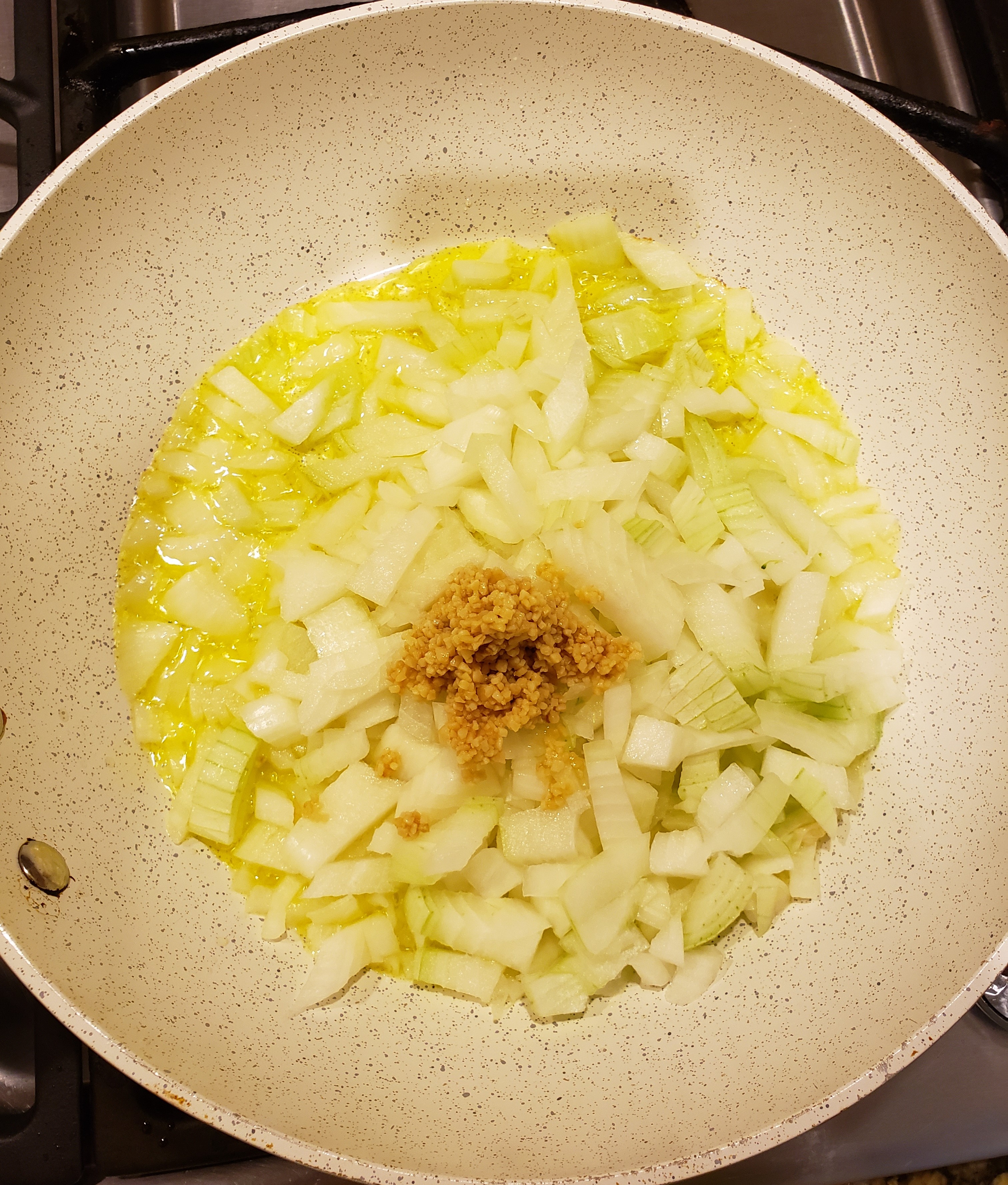 - In a large skillet, saute the onion and garlic until soft.