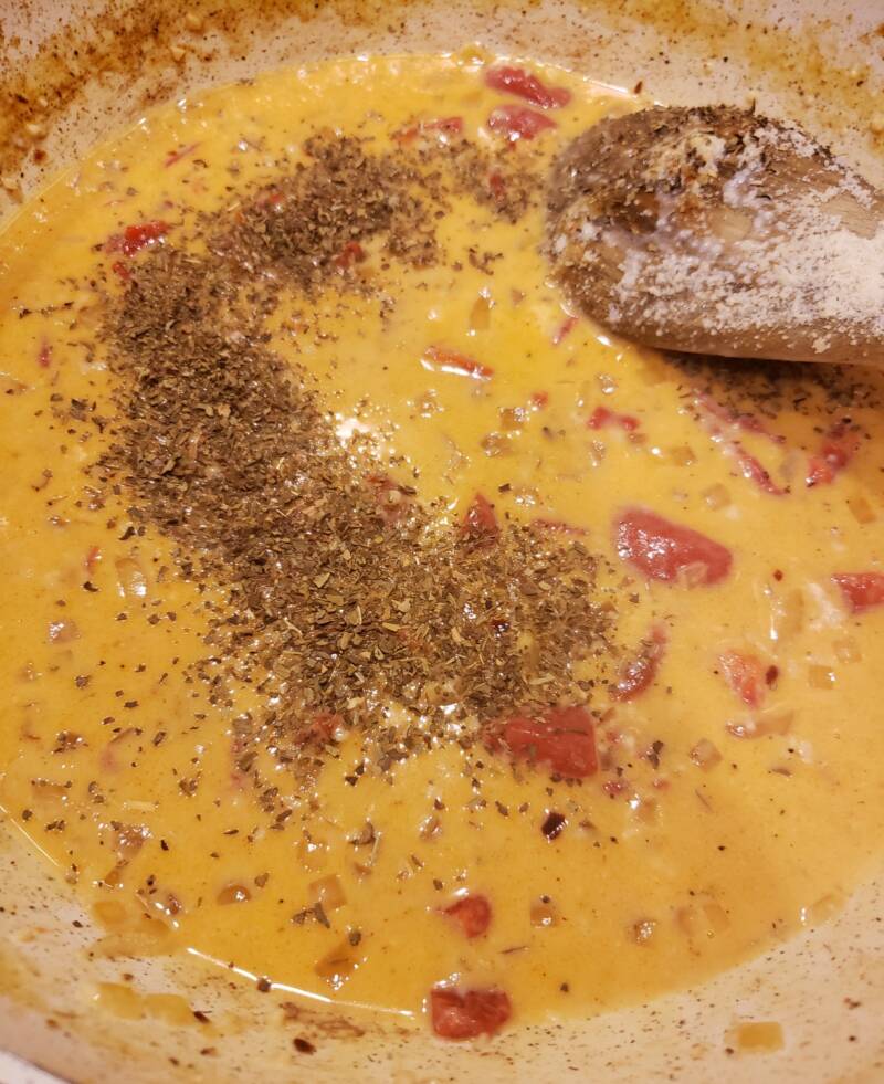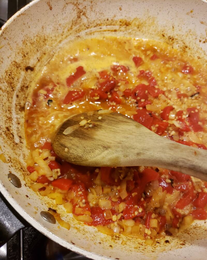 Add the paprika and roasted red pepper. Stir and cook for a couple of minutes.