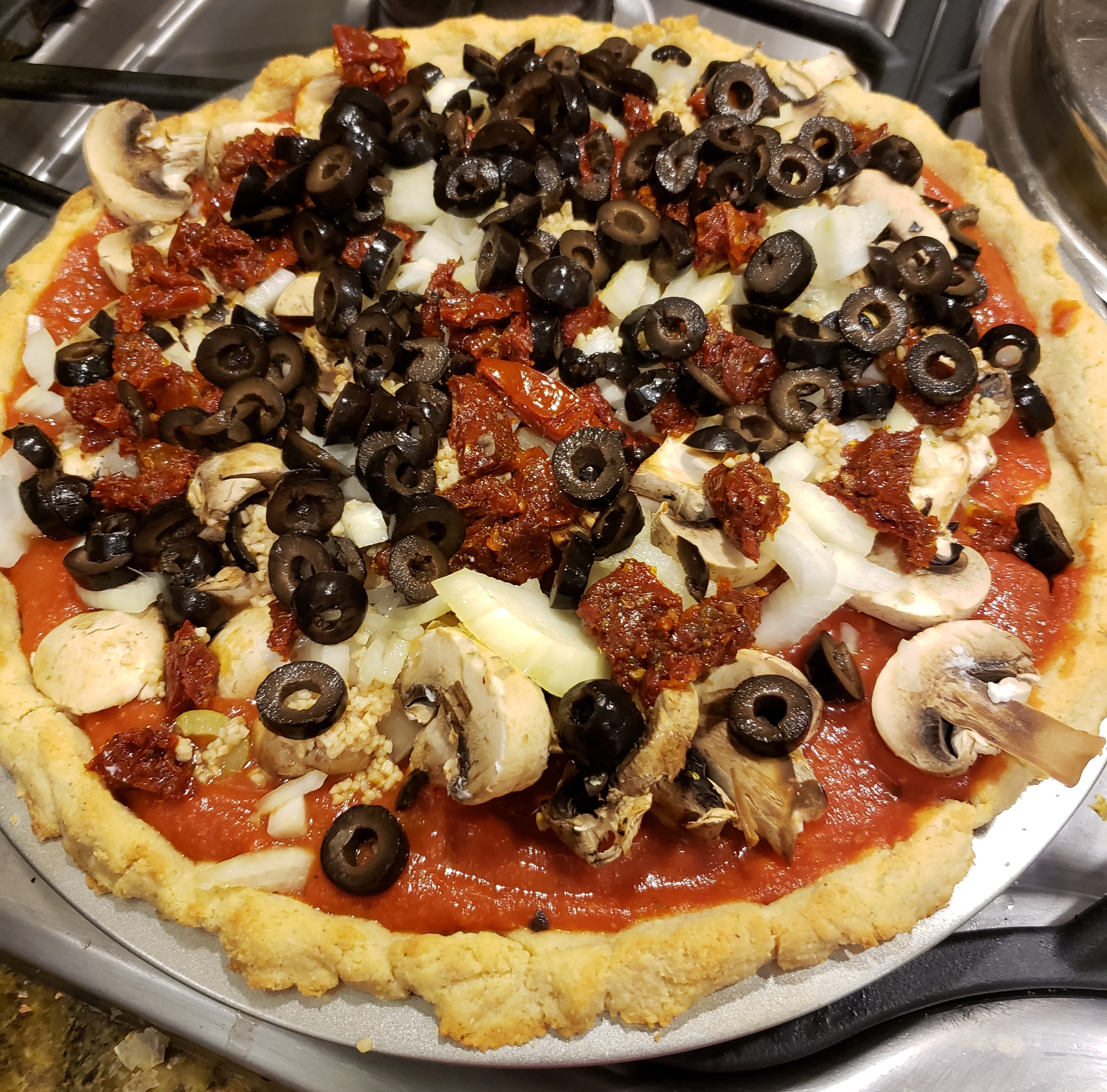 Then add the sliced olives and sundried tomatoes.