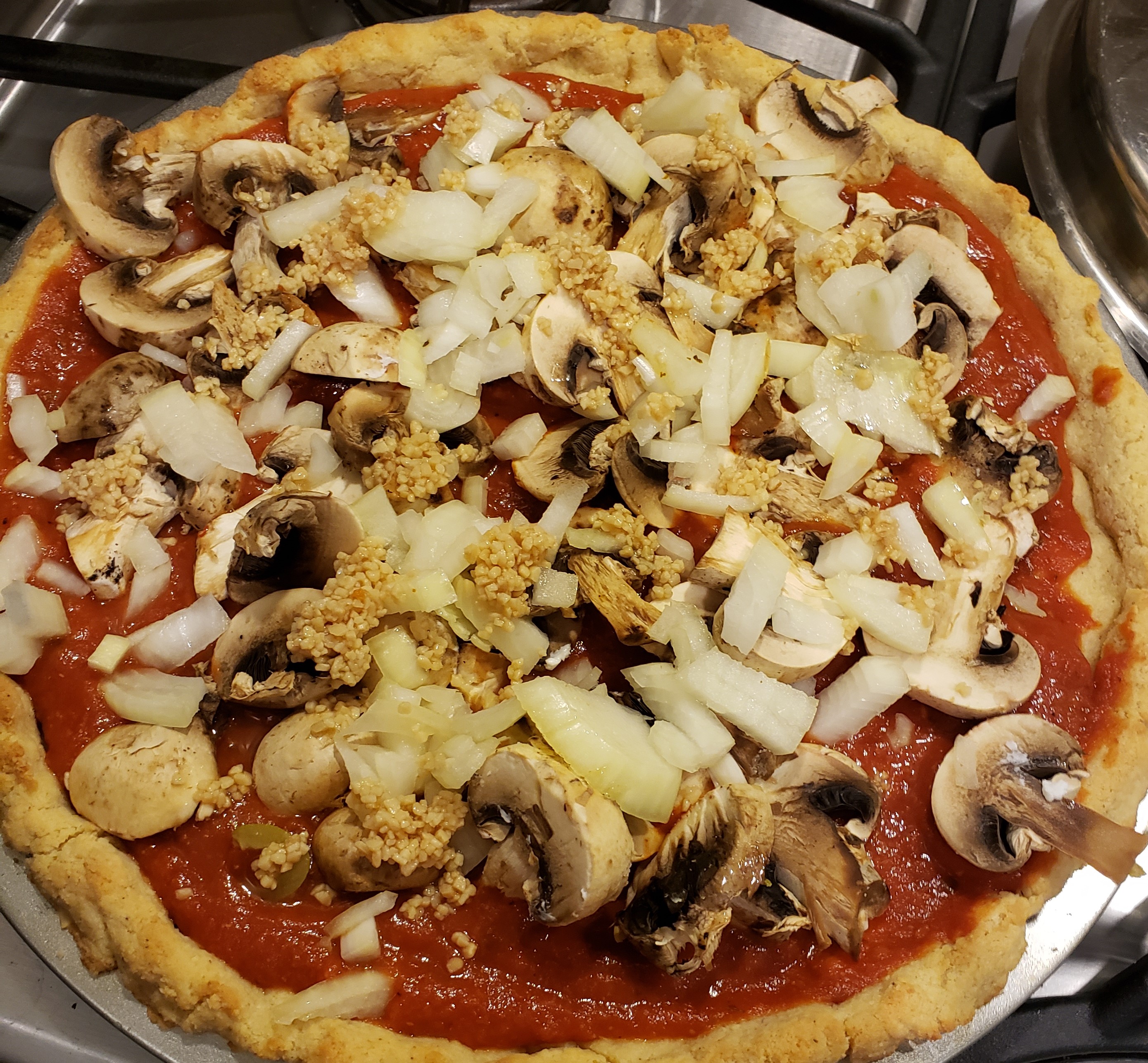 Start adding the toppings. Start with the chopped onion, sliced mushrooms and garlic.