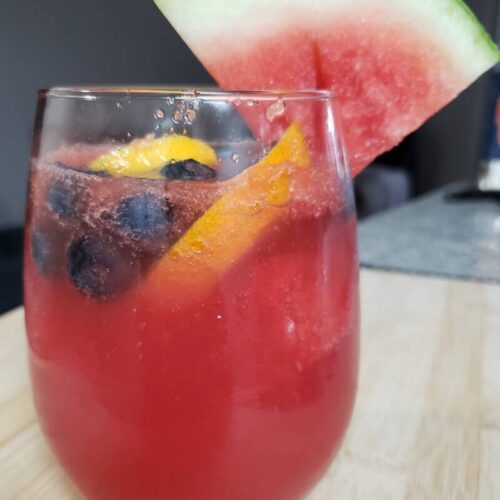 I can tell I am dreaming of warmer days and the coming of Spring when I can sit on the patio in perfect peace, listening to the sounds of nature. My vision somehow always ends up with a cocktail, such as this Watermelon Sangria. Watermelon juice, found near the cold juices in the grocery store is the star of this pretty cocktail. I love this cocktail because it is fizzy and fresh! I mean, really, who doesn’t like bubbles?