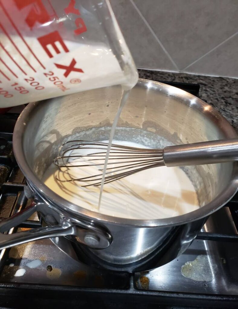 - Begin adding milk a cup at a time while whisking to make sure there are no lumps. Whisk and stir until the mixture thickens.