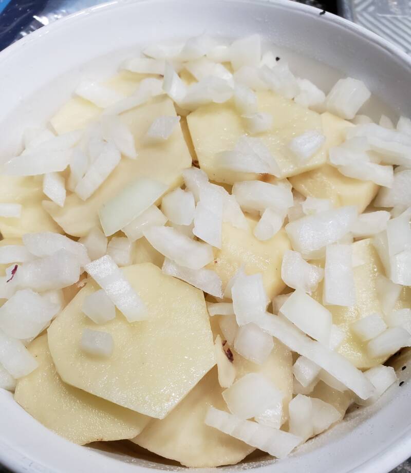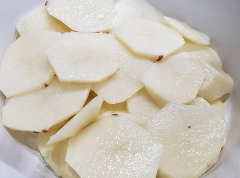 - Place the potato slices on the bottom of the casserole dish.