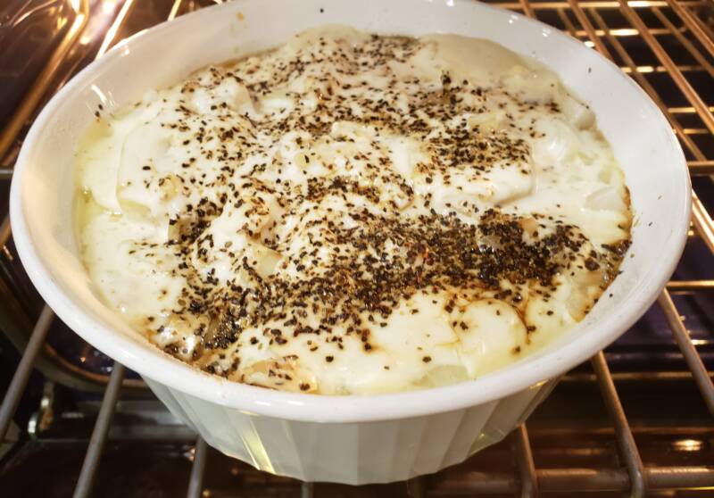 - Place the dish on a baking sheet and bake at 350 degrees until the top is golden.