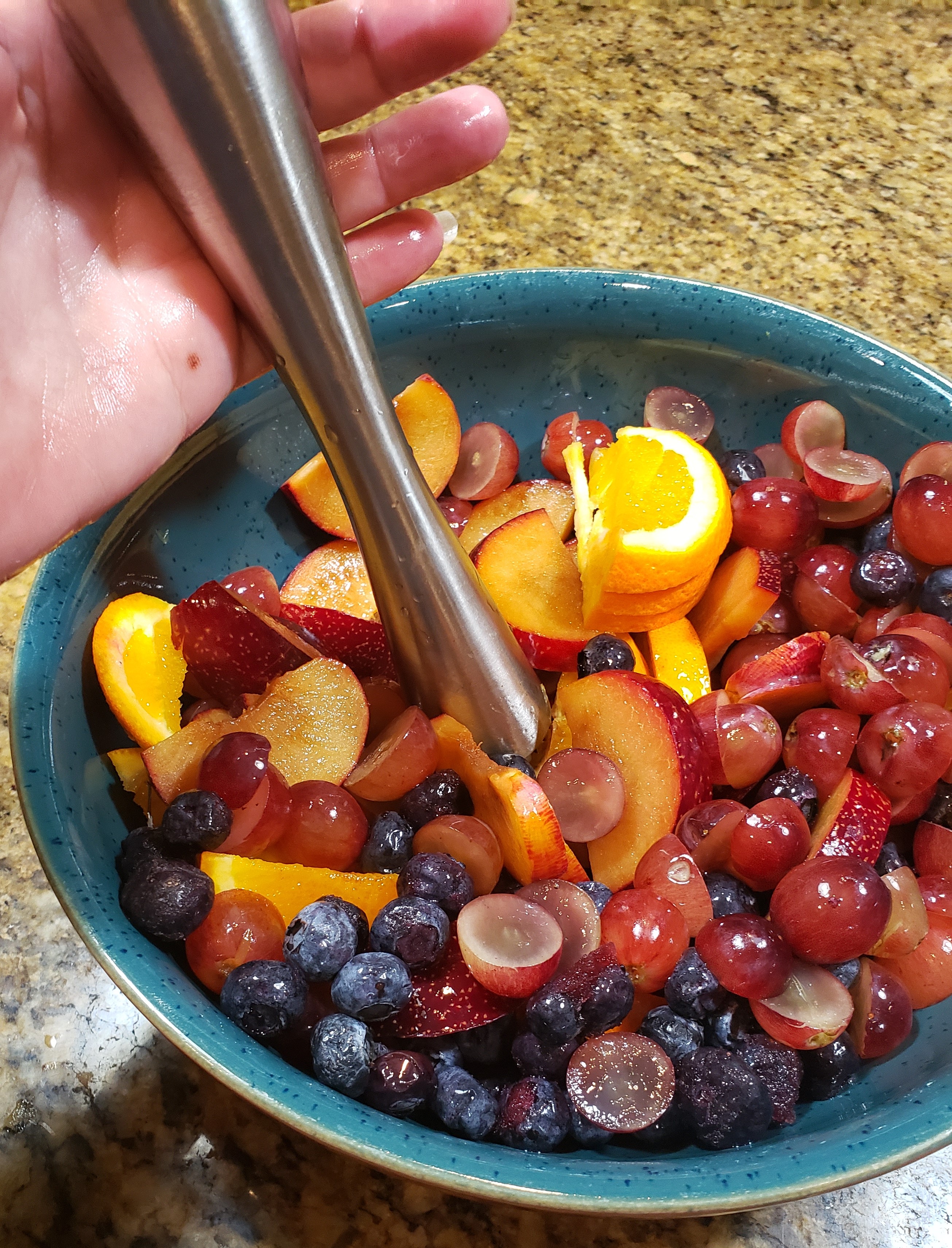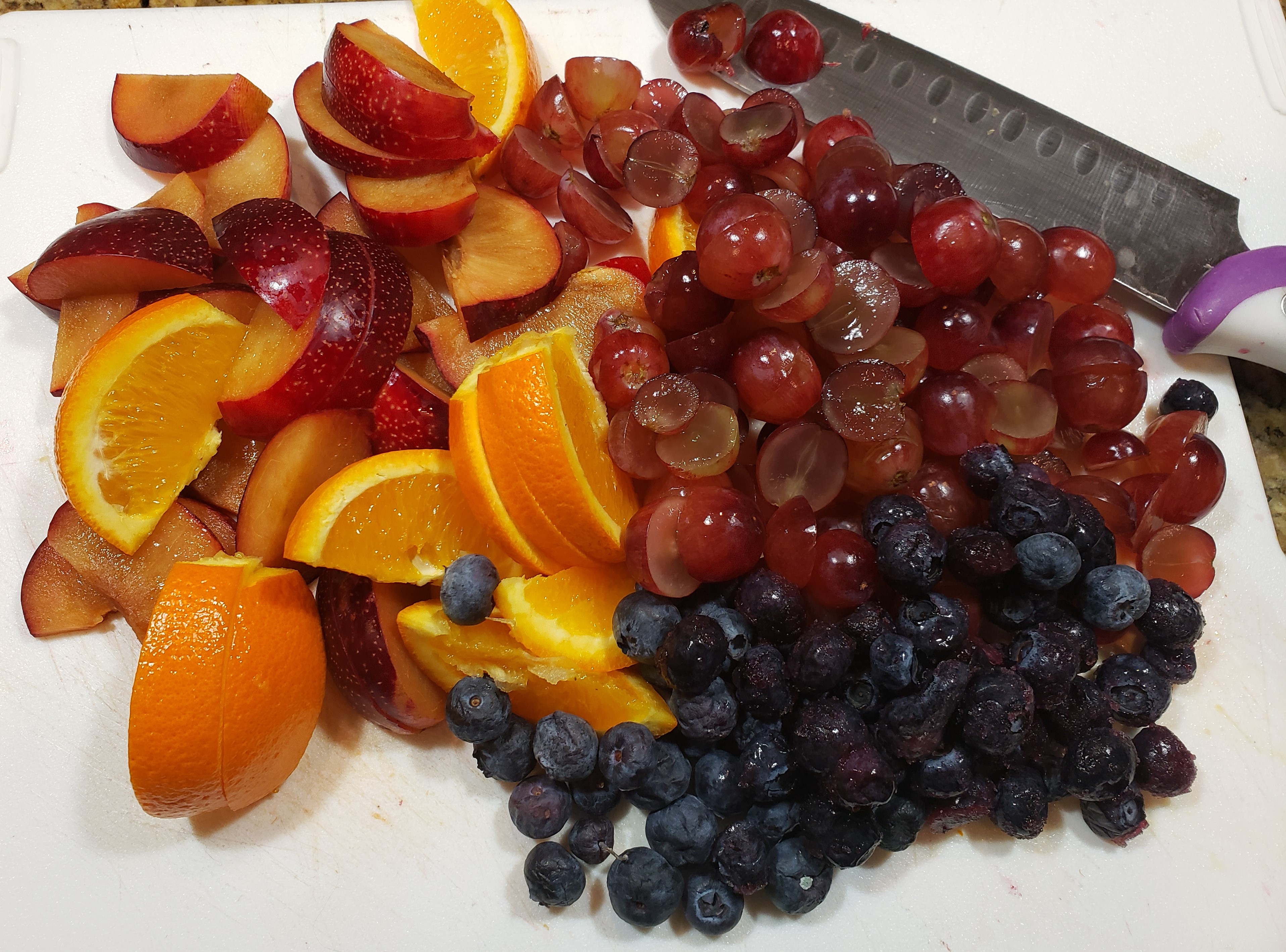 The day before serving the sangria, select the fruit to use. I chose red grapes, oranges, plums and blueberries. The blueberries and red grapes will turn your sangria pink, so if you want your sangria to appear more white, you can use green grapes and another type of fruit, such as kiwi. Slice the plums and oranges into wedges and cut the grapes in half. Place all the fruit in a bowl.
