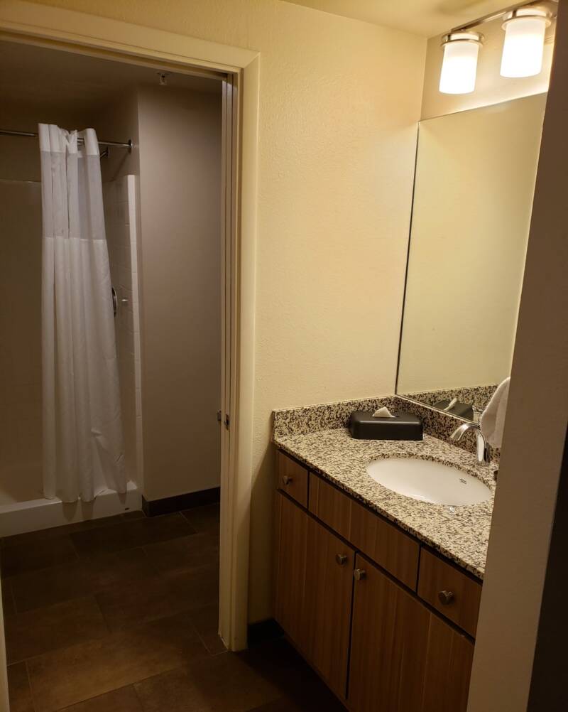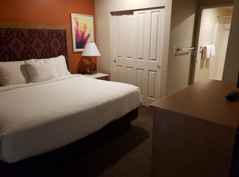 The unit had two bedrooms. The master bedroom contained a king-size bed and private bathroom with a large walk-in shower. The mattress was of good quality. Blackout curtains covered the sliding glass door to the patio, which was nice for sleeping in.