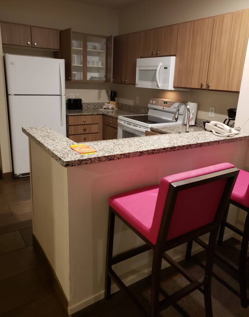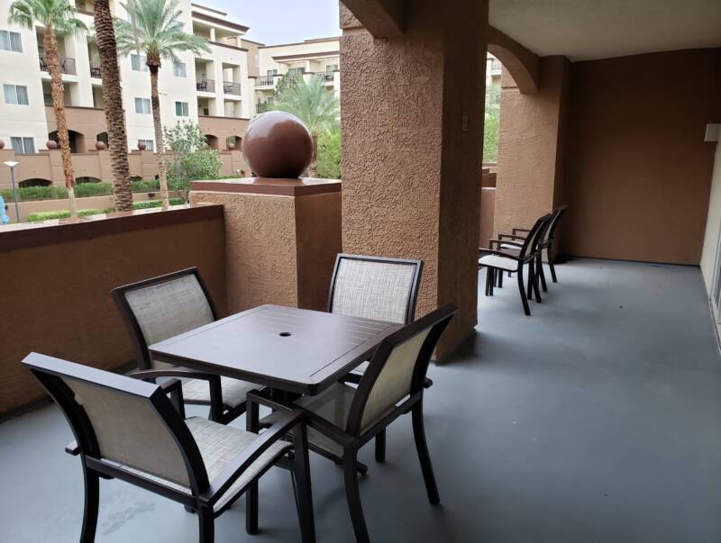 I really enjoyed staying at this resort. Our unit was located on the second floor with a nearby elevator. Covered guest parking is available on the first floor of every building allowing close access to an elevator. The resort provides a flatbed card, like those found at warehouse clubs, such as Costco and Sam’s, for guest to haul their luggage and gear to their units. All units have outdoor entry; The front door of our unit was facing an industrial lot that was not very nice to look at, but the back door view totally made up for that. Our unit had a huge private balcony overlooking a pool. It was not the main pool area, so this pool was fairly quiet. Not all the units had such a huge balcony, so we were grateful for this placement.