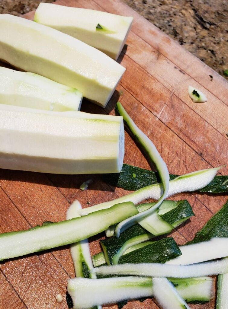 - Cut thin slices from the zucchini and squash. Slice as thin as possible.