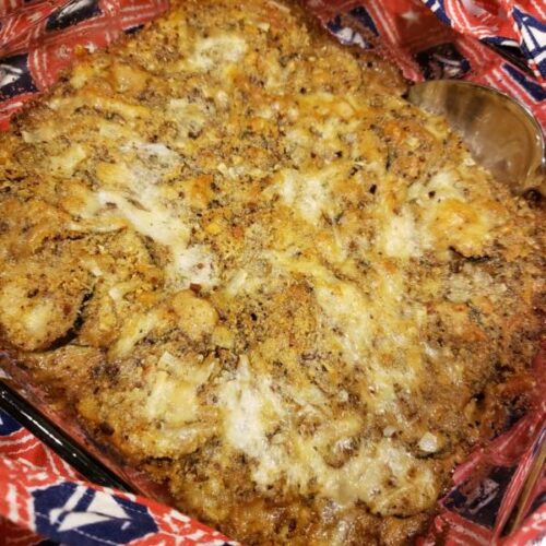 Add the hot milk and cook over low heat for a few minutes until it makes a sauce. Pour into an 8×10 baking dish.