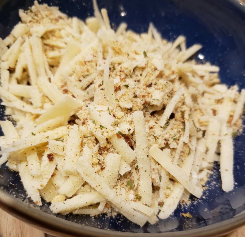 - Combine the breadcrumbs and Gruyere cheese.